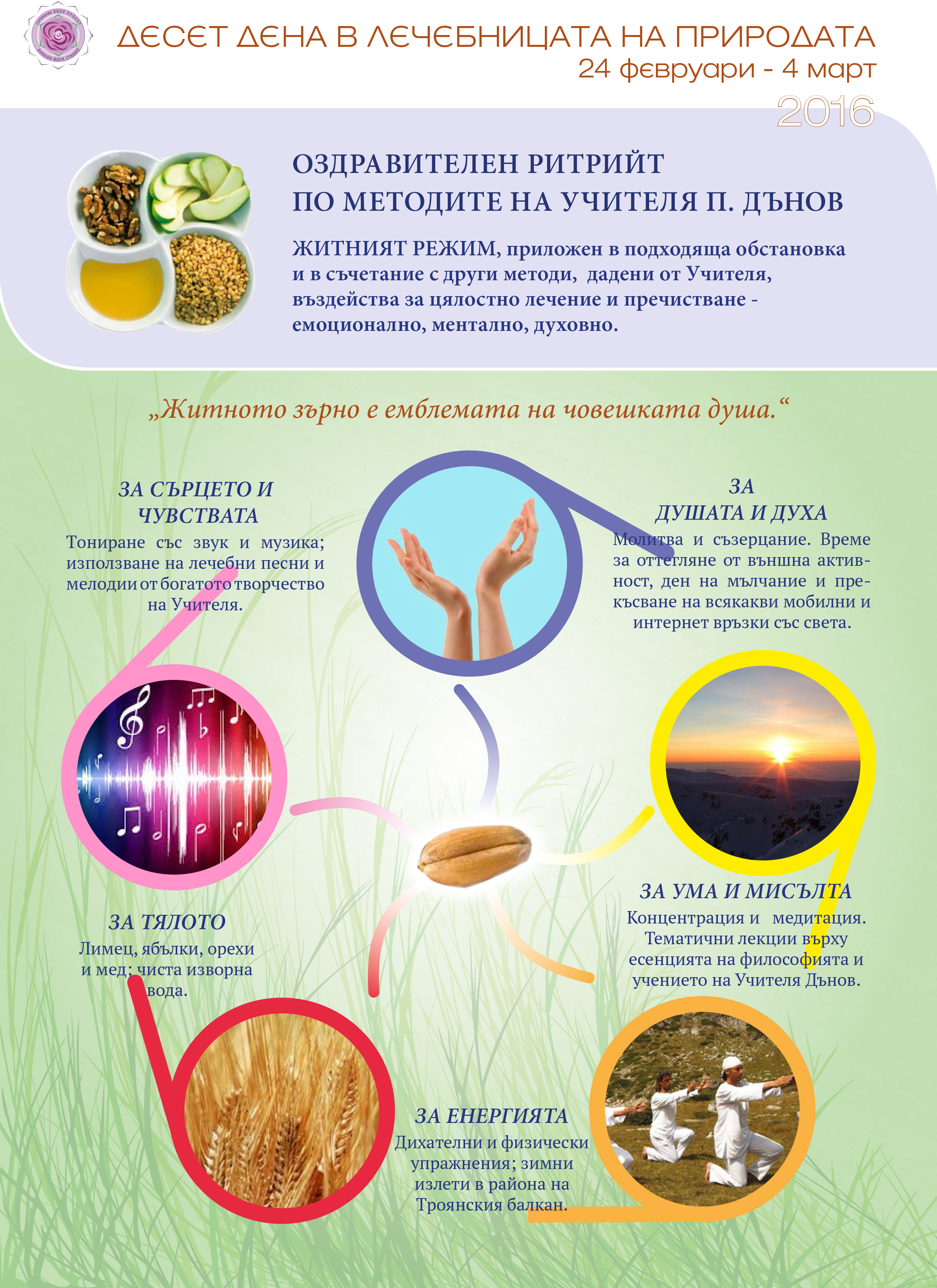 Иво Добавено Декември 13, 2015 Доклад Share Добавено Декември 13, 2015 ОЗДРАВИТЕЛЕН РИТРИЙТ ПО МЕТОДИТЕ НА УЧИТЕЛЯ П. ДЪНОВ ЖИТНИЯТ РЕЖИМ, приложен в подходяща обстановкаи в съчетание с други методи, дадени от Учителя,въздейства за цялостно лечение и пречистване –емоционално, ментално, духовно. https://www.facebook.com/events/1679982658938798/http://anandaproject.net/житен-ритрийт-2016/Администраторска бележка: обсъждане на името на събитието, можете да правите тук Орлин Баев, Мария-София, Vrinda и 2 others 5 Цитирай Линк към коментар Share on other sites More sharing options...